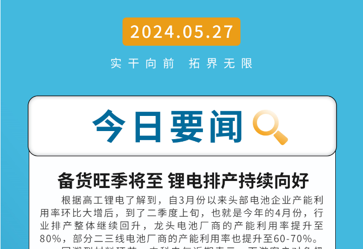 1、備貨旺季將至 鋰電排產持續(xù)向好根據高工鋰電了解到,自3月份以來頭部電池企業(yè)產能利用率環(huán)比大增后,到了二季度上旬,也就是今年的4月份,行業(yè)排產整體繼續(xù)回升,龍頭電池廠商的產能利用率提升至80%,部分二三線電池廠商的產能利用率也提升至60-70%?;厮莸讲牧檄h(huán)節(jié),中科電氣近期表示,下游客戶對負極材料需求量較大,公司產能利用率處于較高水平;德方納米表示,公司目前排產率較高,二季度下游回暖趨勢比較明顯,產能利用率預計保持較高水平;新宙邦預計二季度電解液出貨量有比較穩(wěn)定的環(huán)比增長。而在下游車市,持續(xù)穩(wěn)定的增長為鋰電…