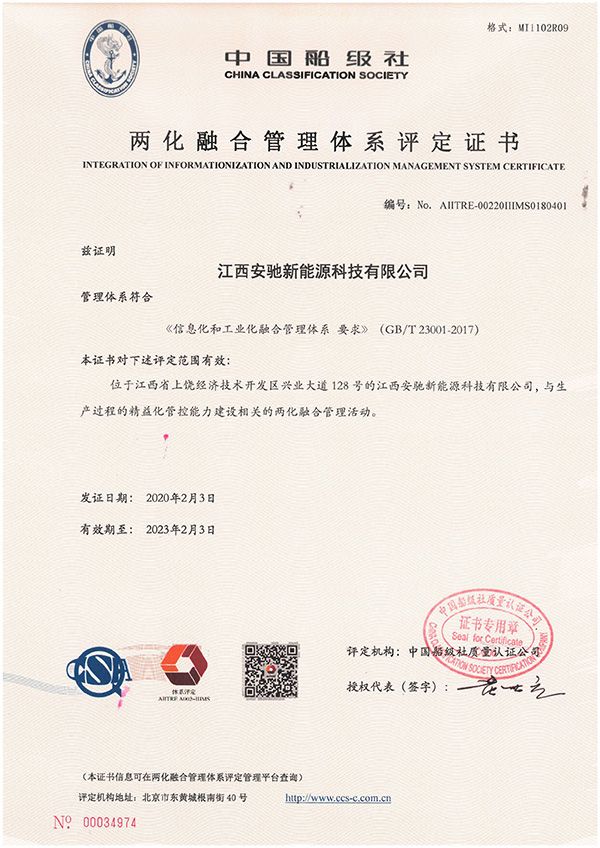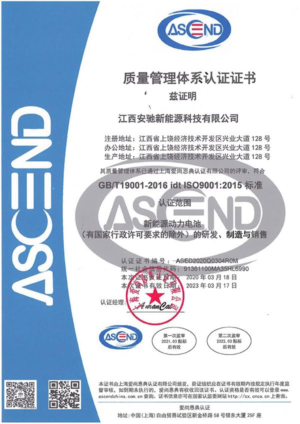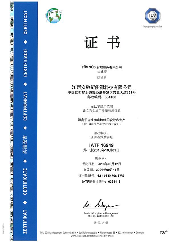 安馳新能源科技有限公司自建廠伊始,就以汽車行業(yè)體系為起點建立了高標(biāo)準(zhǔn)的質(zhì)量管理體系,取得了TUV南德頒發(fā)的IATF 16949:2016質(zhì)量管理體系證書。